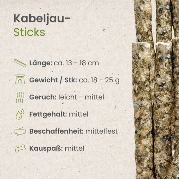 Een eerlijke vissnack - De kabeljauwsticks bieden honden niet alleen een intense smaak, maar ook veel waardevolle waardevolle uit de zee. Deze smakelijke kauwstaven bestaan voornamelijk uit vers kabeljauw en zijn een bijzonder natuurlijke beloning voor tussendoor. Door de middelharde consistentie zijn de sticks ideaal voor kleine tot middelgrote honden. Visliefhebbers op vier poten komen hier volledig aan hun trekken. De aanwezige omega-3-vetzuren ondersteunen de huid en vacht, terwijl de graanvrije receptuur een bijzonder goede draagbaarheid biedt.